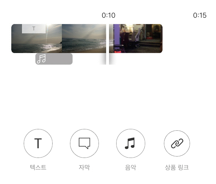 다음으로 넘어가면 이제 영상에 입힐 ‘텍스트와 음악’이다. 하단의 바를 살펴보면 텍스트, 자막, 음악이 나란히 놓여 있다. 이는 포토샵의 레이어 기능처럼 생각하면 쉽다. 영상 레이어 위에 텍스트 레이어 그 위에 음악 레이어를 차곡차곡 쌓는다는 생각으로 편집하면 된다. 자, 점점 아무런 연관도, 쓸모도 없어 보였던 영상들에 숨이 불어 넣어지고 쓸고퀄로 나아가고 있다.